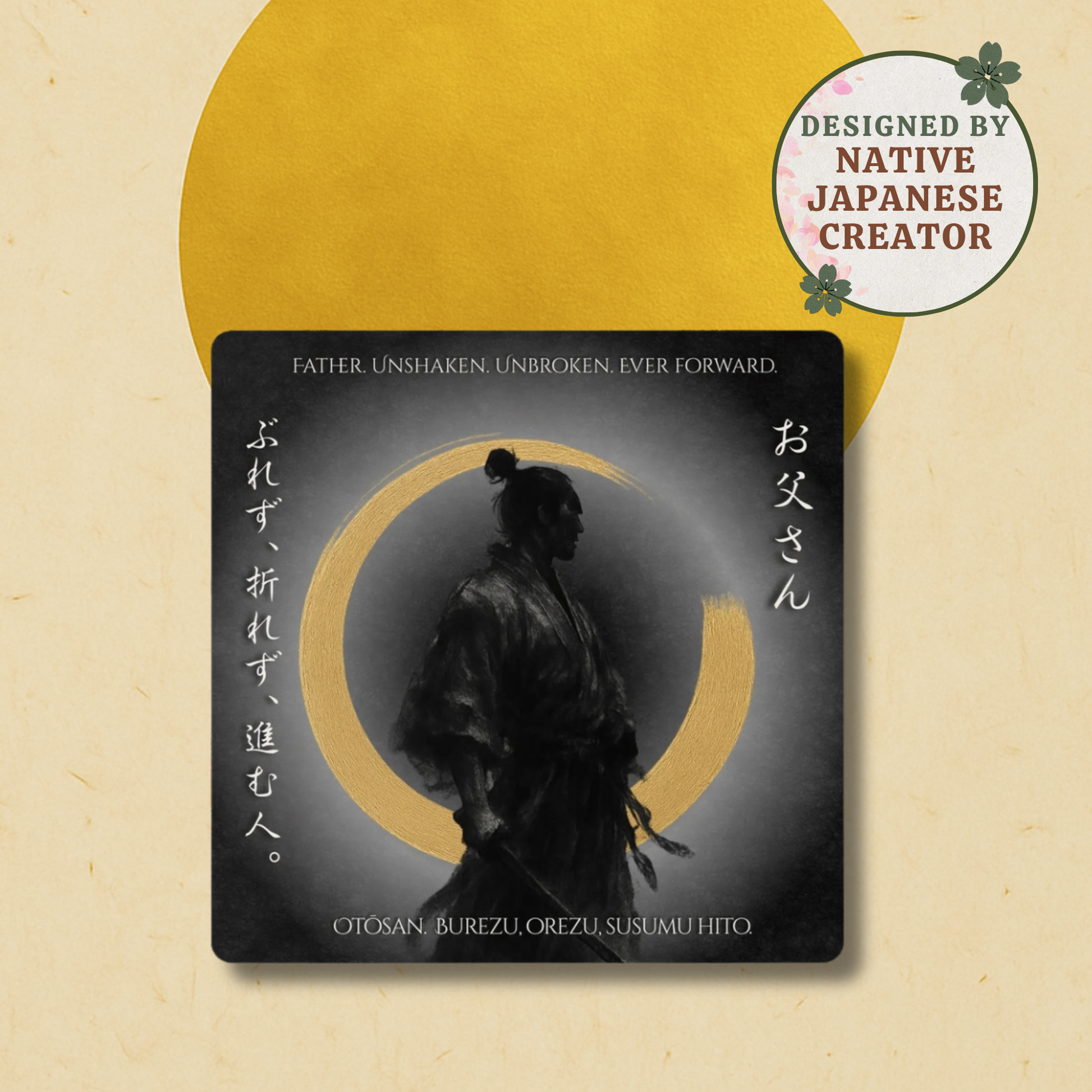 This 2-pack coaster set features a samurai silhouette surrounded by a golden Zen circle (ensō), layered with Japanese text, romaji, and English translation — designed to honor fathers who lead with quiet strength.