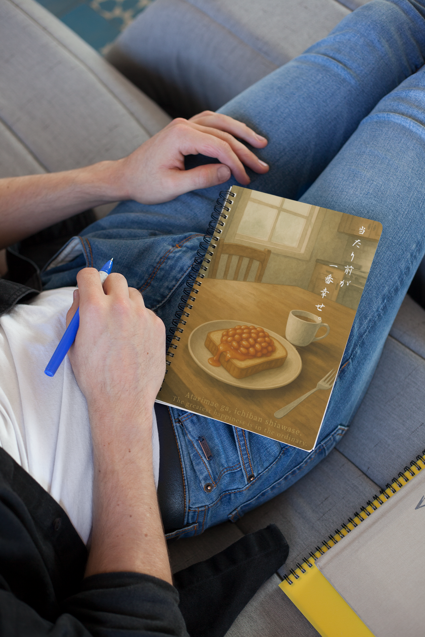 This notebook quietly celebrates the beauty of everyday life. The Japanese phrase on the cover, 「当たり前が、いちばん幸せ。」translates to: “The greatest happiness is in the ordinary.”